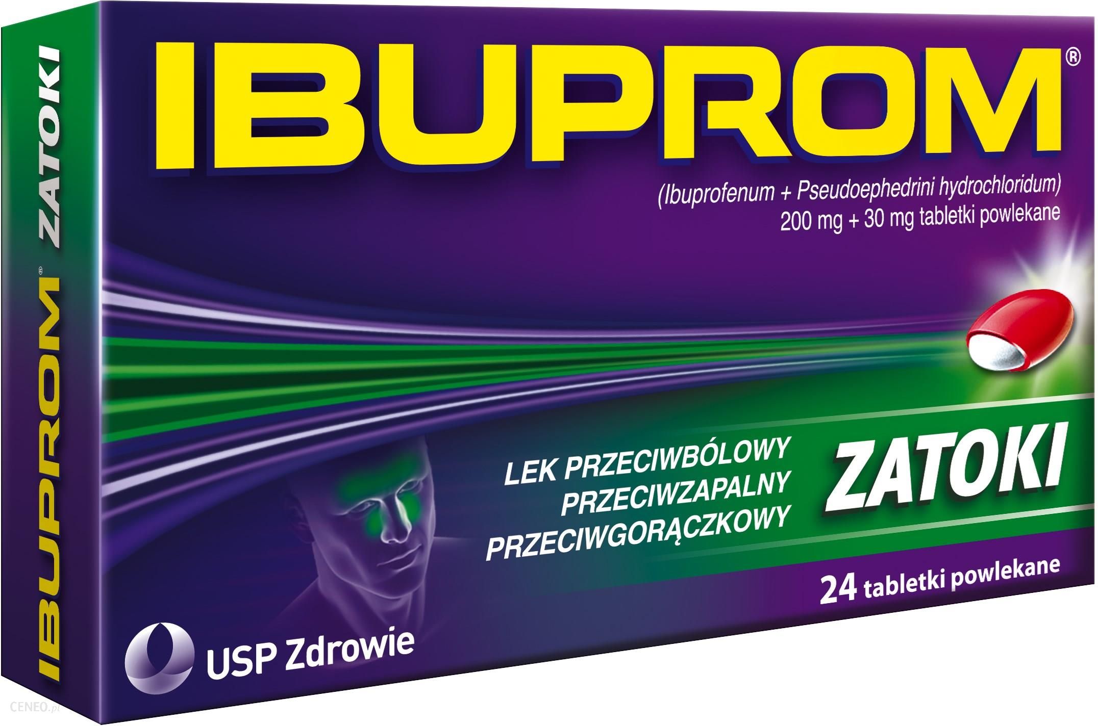 IBUPROM ZATOKI 24 tabl.Ibuprom Zatoki jest lekiem wskazanym do stosowania doraźnego celem złagodzenia objawów występujących w przeziębieniu i grypie, takich jak: ból głowy, katar, gorączka, ból i niedrożność zatok obocznych nosa, ból gardła oraz bóle mięśniowe. Polecany również do stosowania celem doraźnego leczenia objawów zapalenia zatok, takich jak: ból głowy, niedrożność zatok i nosa, które przebiegają z bólem i są konsekwencją powikłań przeziębienia, grypy lub alergicznego nieżytu nosa. Lek adresowany do osób dorosłych oraz młodzieży powyżej 12. roku życia.