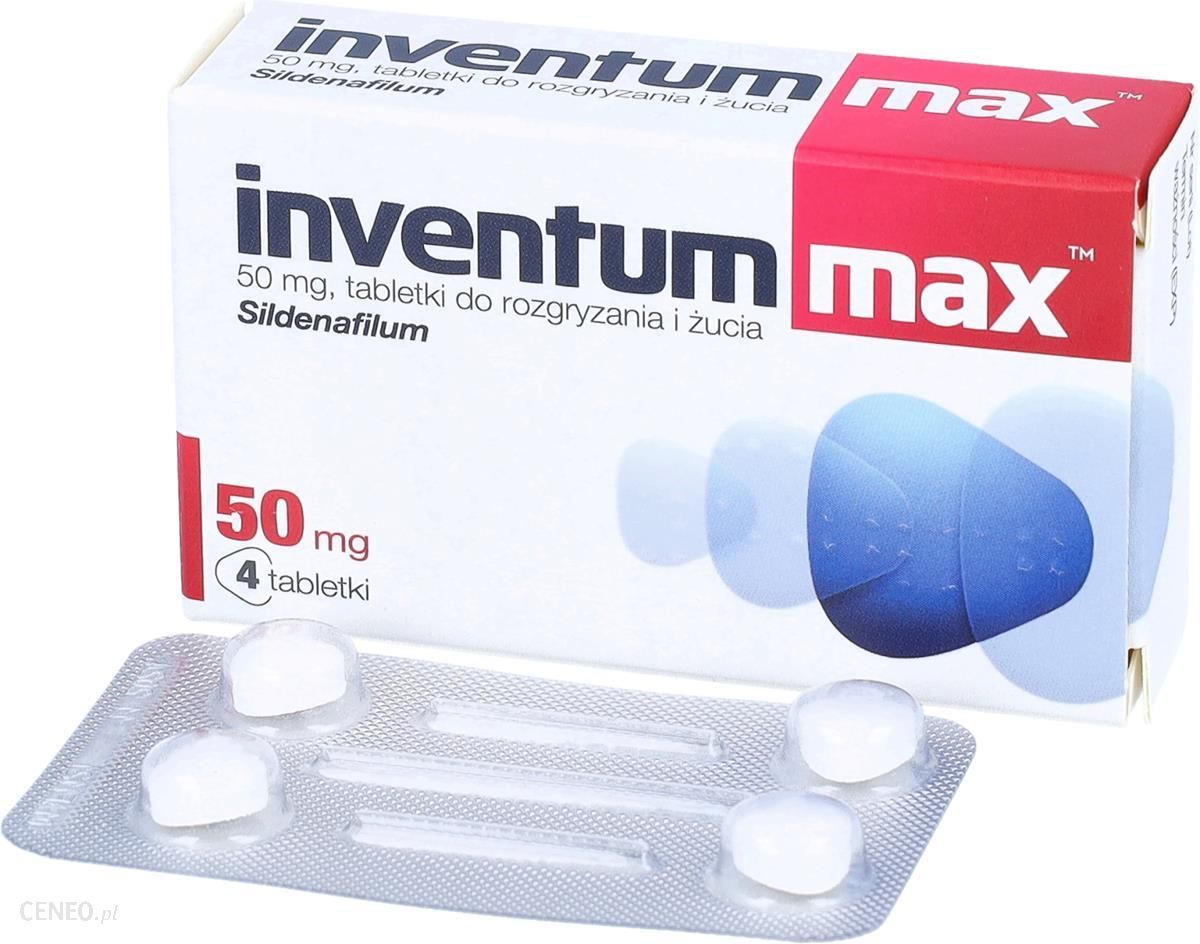 Stosowanie:Jeśli pacjent stosował wcześniej leki zawierające syldenafil w dawce 50 mg lub większej, zalecana dawka leku to 50 mg. W przeciwnym razie lek Inventum Max w dawce 50 mg należy stosować tylko w przypadku, jeśli pacjent po zastosowaniu syldenafilu w dawce 25 mg nie odczuł pożądanego efektu (czyli nie uzyskał wzwodu wystarczającego do odbycia stosunku).Jeśli zastosowanie leku zawierającego syldenafil w niższej dawce (25 mg) pozwoliło na uzyskanie erekcji umożliwiającej odbycie stosunku seksualnego nie należy stosować leku w dawce 50 mg.Lek Inventum Max należy przyjmować na około godzinę przed planowaną aktywnością seksualną.Tabletkę Inventum Max należy rozgryźć i żuć do rozpuszczenia, tabletka nie wymaga popijania.