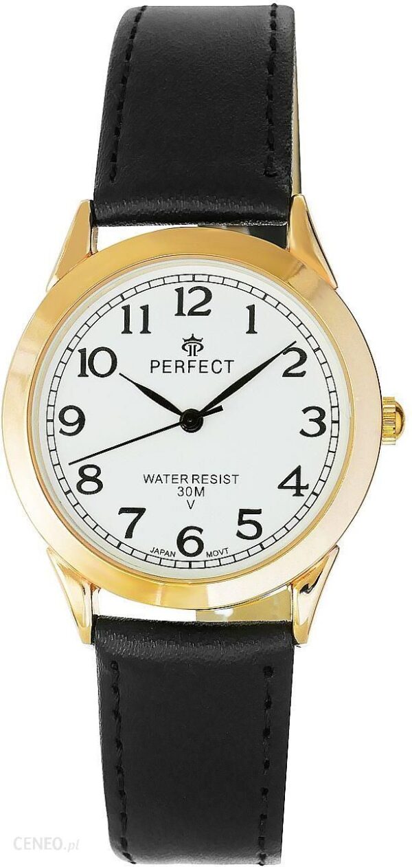 Zegarek Damski PERFECT 027Oficjalna Polska dystrybucja Opis produktu:Marka: PerfectMechanizm: Kwarcowy Miyota Citizen JapanTarcza: AnalogowaKoperta: Wysokogatunkowa stalSzkiełko: Mineralne o podwyższonej odporności na zarysowania i przypadkowe uderzeniaPasek: Skóra naturalnaWodoszczelność: 3 ATMAntyalergiczny: Tak – nie zawiera niklu – doskonały dla alergikówOryginalność: Na denku zegarek posiada wygrawerowane informacje od producenta, świadczące o oryginalności. Wymiary w mm:Koperta: średnica: 35Tarcza: średnica: 28Grubość: 7,5Pasek: 18Obwód: 195-230 Kolorystyka:Koperta: złotaTarcza: białaIndeksy: czarneWskazówki: czarneSekundnik: czarnyPasek: czarny, nitka: czarna