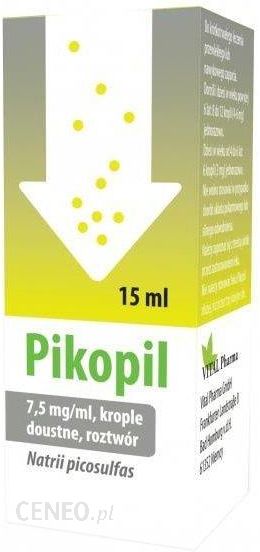 Pikopil należy do grupy leków przeczyszczających o działaniu drażniącym. Działa poprzez stymulację ruchów jelita oraz zwiększa zawartość wody i elektrolitów w świetle jelita grubego. Pikopil krople 7,5 mg/ml jest stosowany do krótkotrwałego łagodzenia dolegliwości związanych z przewlekłym lub nawracającym zaparciem u dorosłych i dzieci w wieku powyżej 4 lat.Zarejestrowane wskazania do stosowania: krótkotrwałe leczenie przewlekłego lub nawykowego zaparcia. Skład 1 ml leku Pikopil zawiera pikosiarczan sodu w ilości odpowiadającej 7,5 mg bezwodnego pikosiarczanu sodu (1 ml = 15kropli).Pozostałe składniki: benzoesan sodu, sorbitol, jednowodny kwas cytrynowy, cytrynian sodu, woda do wstrzykiwań. StosowanieO ile lekarz nie zaleci inaczej, zwykła dawka wynosi: Dorośli: 8 do 12 kropli (4 – 6 mg) jednorazowo. Dzieci i młodzież: Dzieci w wieku powyżej 6 lat: 8 do 12 kropli (4 – 6 mg) jednorazowo. Dzieci w wieku od 4 do 6 lat: 6 kropli (3 mg) jednorazowo. Przed użyciem zapoznaj się z ulotką, która zawiera wskazania, przeciwwskazania, dane dotyczące działań niepożądanych i dawkowanie oraz informacje dotyczące stosowania produktu leczniczego, bądź skonsultuj się z lekarzem lub farmaceutą, gdyż każdy lek niewłaściwie stosowany zagraża Twojemu życiu lub zdrowiu.