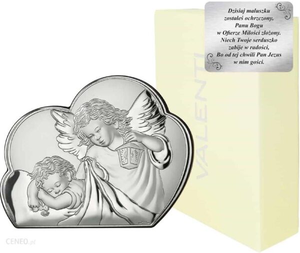 Obrazek srebrny Aniołek z latarenką. Idealny prezent jako pamiątka Chrztu Świętego.Obrazek wyprodukowany został przez firmę Valenti. Gwarantuje ona, iż przedmiot nabyty przez Państwa został wyprodukowany we Włoszech, z metalu pokrytego czystym srebrem w technologii PVD zgodnie z dekretem 206/2005 art.6. Dzięki temu jest odporniejszy na odkształcenia mechaniczne i śniedzenie, doskonale odbija światło, co podkreśla szlachetność srebra. Obrazek zabezpieczony jest warstwą lakieru, która chroni przed czynnikami zewnętrznymi. Wpływa to na bezproblemowe użytkowanie bez potrzeby częstego czyszczenia.Obrazek Aniołek z latarenką stanowi idealny prezent okolicznościowy, który powinien znaleźć się w każdym domu.